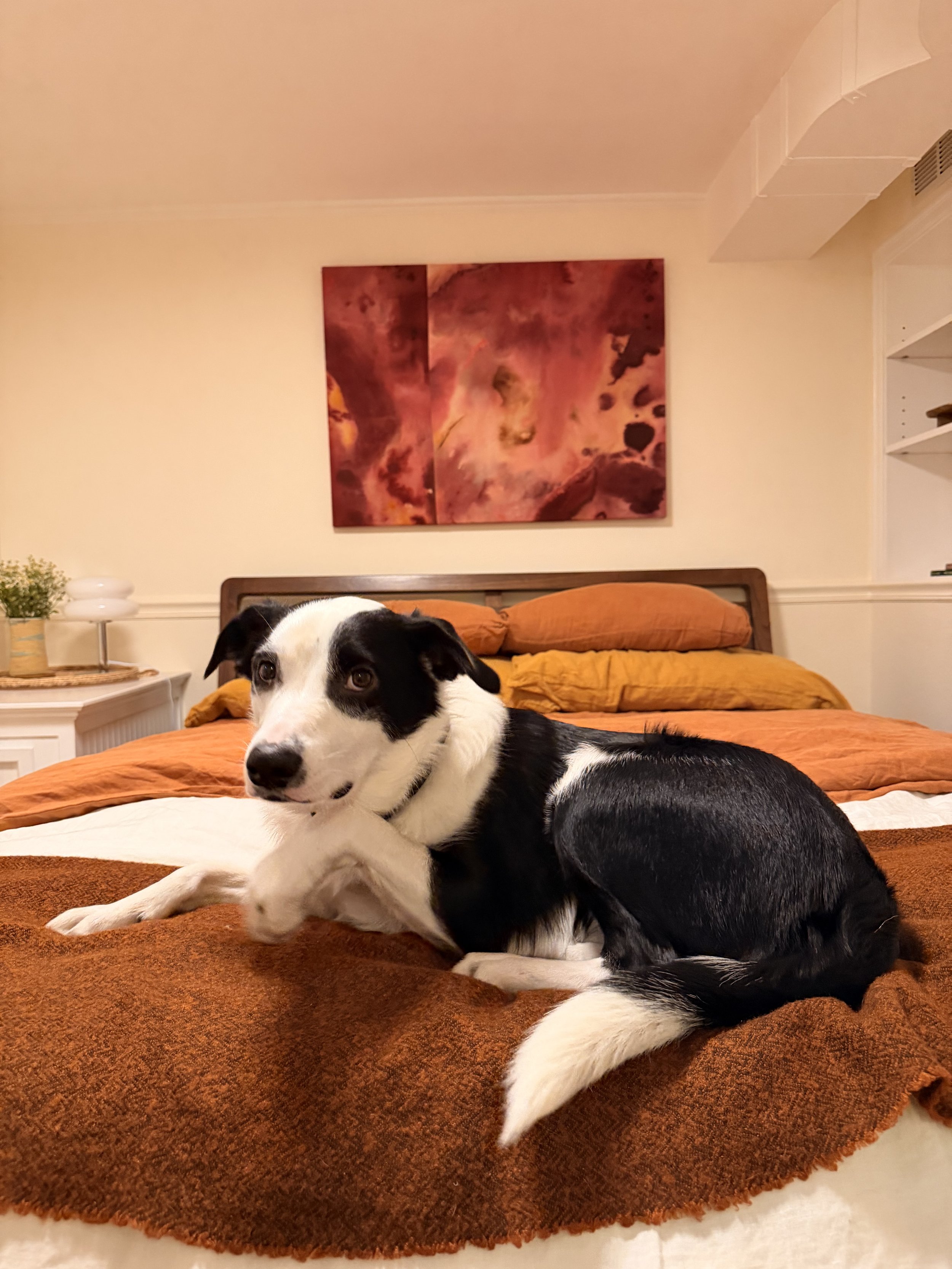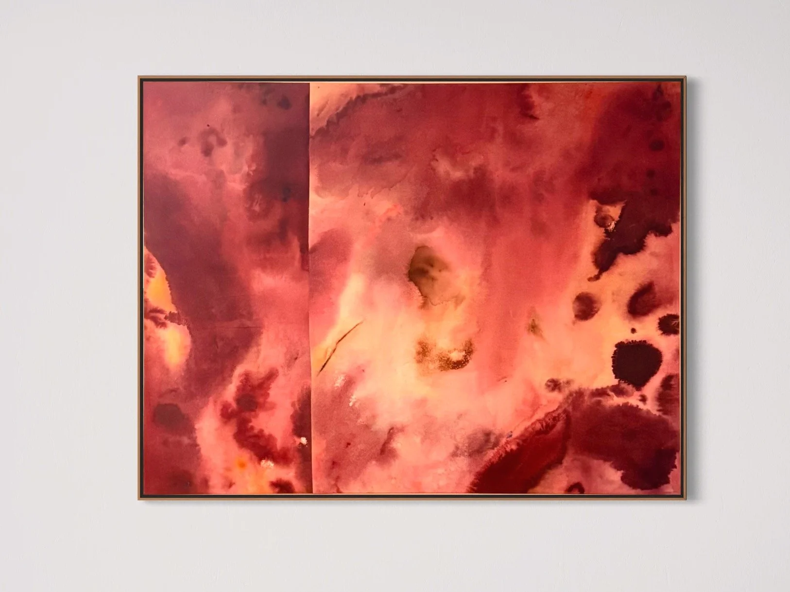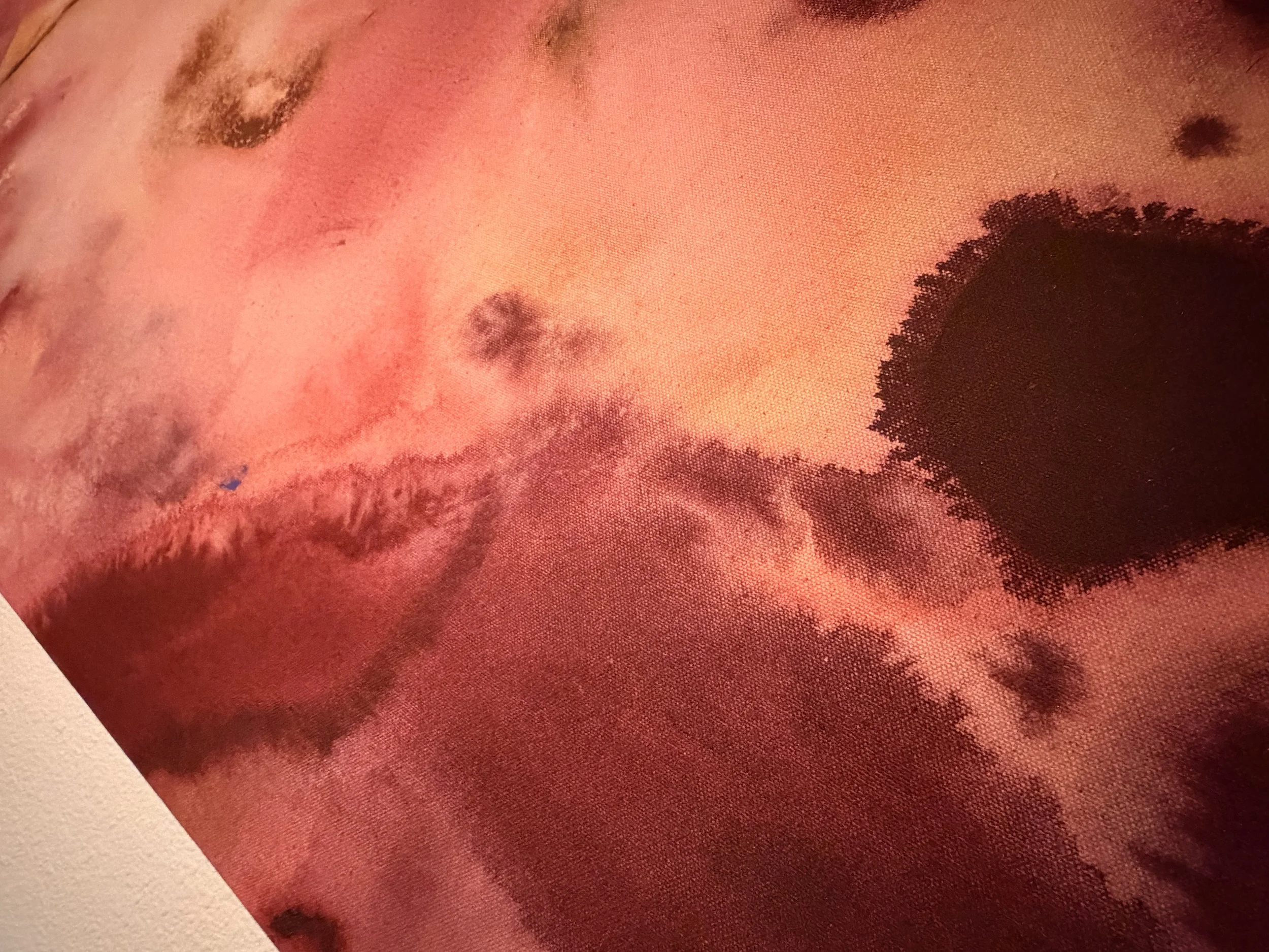 “Cosmos at Dusk” is inspired by the Sandia Mountains of New Mexico, where desert cosmos catch the last pink light of evening. Painted with acrylic and ink on raw canvas, the piece (2 panels sewn together) feels calm and warm, with a quiet pulse of energy—like the moment dusk settles and the desert begins to glow